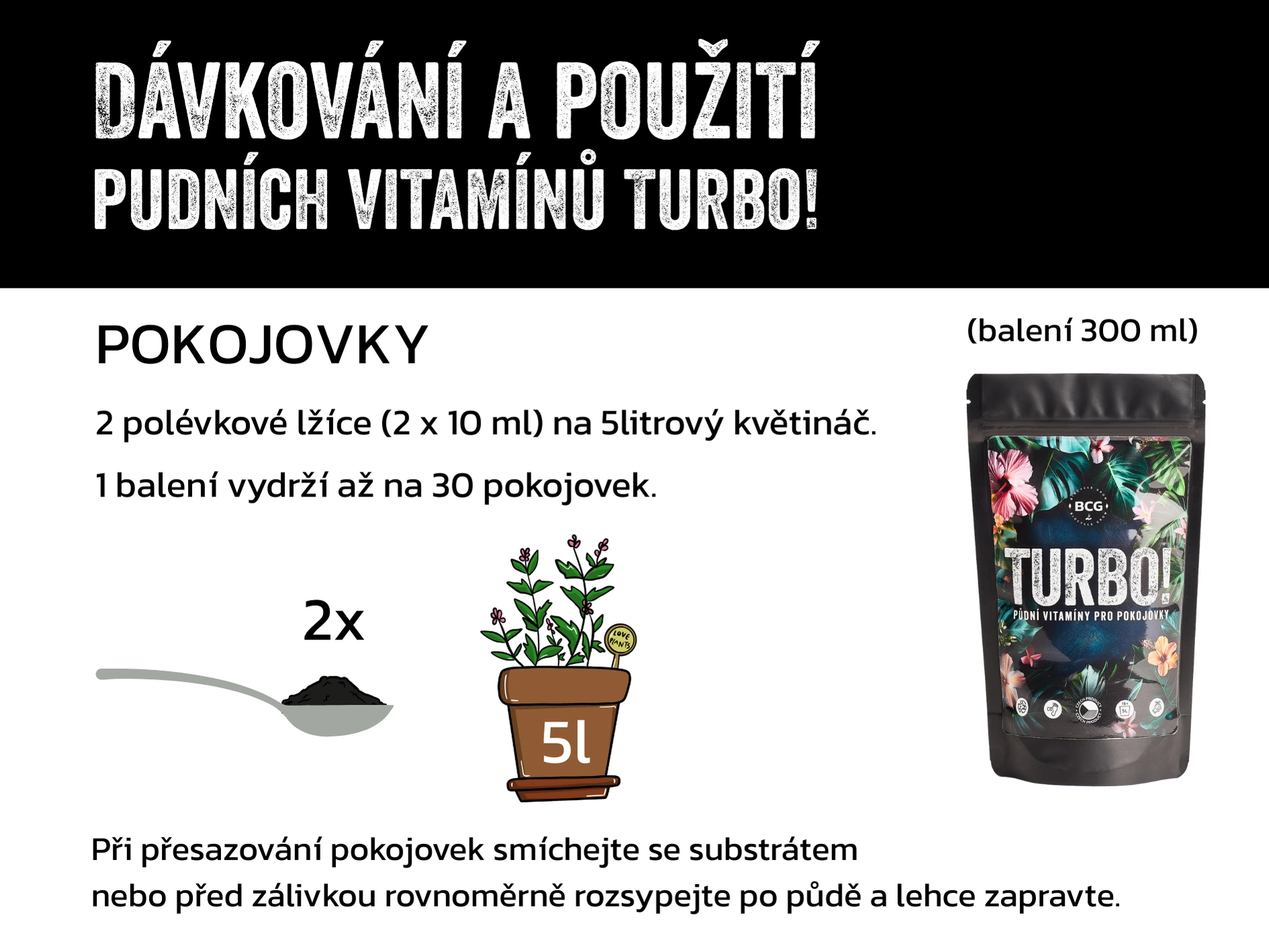 Jak jej používat: 2× polévková lžíce TURBO! (2× 10 ml) na 5litrový květináč, nebo rovnoměrné rozsypání po povrchu.