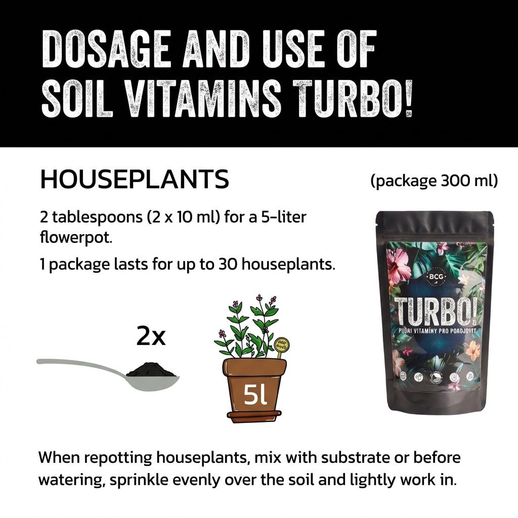 Půdní vitamíny TURBO! jsou unikátní v tom, že dodávají pokojovkám živiny postupně, čímž snižují potřebu častého hnojení. Doporučená aplikace je 3x ročně (jaro, léto, podzim).